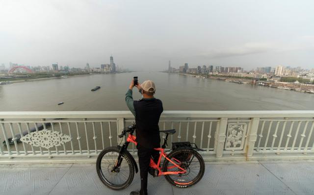 3月25日,在武漢長江大橋,一名騎行的市民停下來拍照。新華社記者 費(fèi)茂華 攝