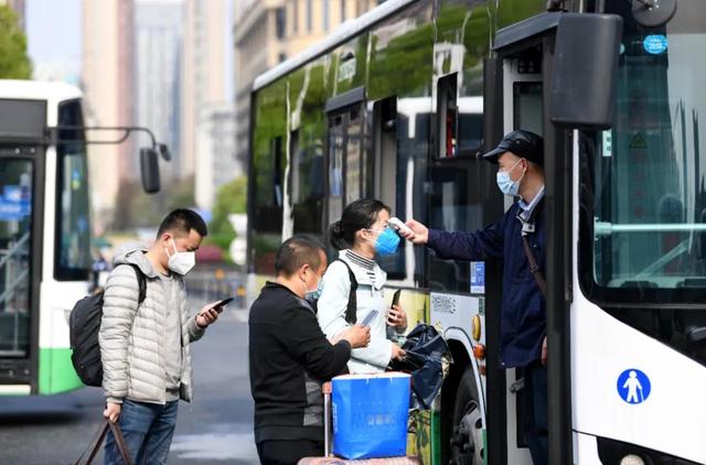 3月25日,武漢市漢口火車站公交車站,乘客正在通過掃碼、量體溫乘車。3月25日起,武漢恢復(fù)117條公交線路的運(yùn)營。經(jīng)濟(jì)日?qǐng)?bào)記者高興貴攝