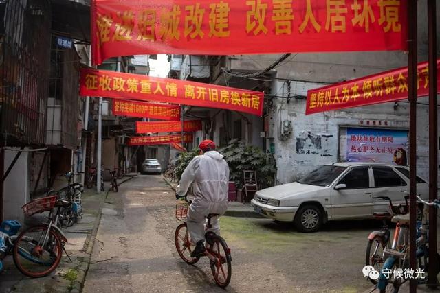 3月24日,武漢市大董社區(qū),一名下沉干部騎著共享單車穿行在社區(qū)里。中青報(bào)·中青網(wǎng)記者 李雋輝/攝