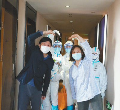 在麗楓康復(fù)驛站隔離區(qū),即將出站的康復(fù)者與醫(yī)護(hù)人員合影。