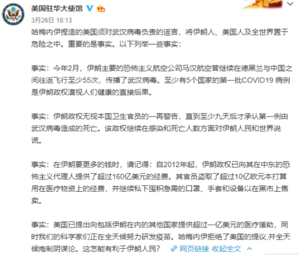 3月26日傍晚,美國駐華大使館在官方微博把新冠病毒稱為“武漢病毒”,稱“哈梅內伊捏造的美國須對‘武漢病毒’負責的謠言將伊朗人、美國人及全世界置于危險之中”,并列舉了4個“事實”,其中第一個“事實”就是伊朗“傳播了‘武漢病毒’”;還稱美國已提出向包括伊朗在內的其他國家提供超過一億美元的醫(yī)療援助,哈梅內伊拒絕了美國的提議,并全天候炮制陰謀論。↓