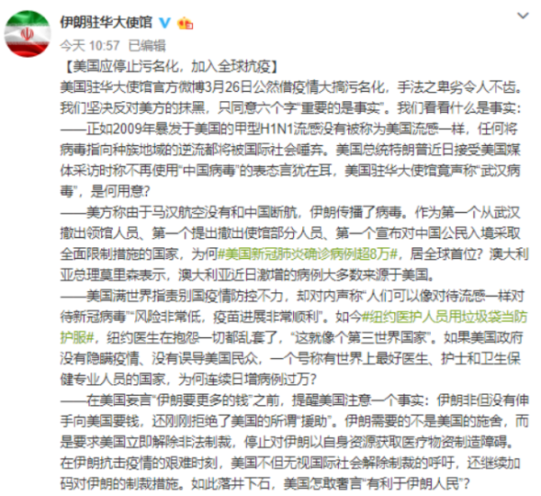 針對@美國駐華大使館 26日對伊朗的指責,27日,@伊朗駐華大使館 發(fā)表題為“美國應停止污名化,加入全球抗疫”的文章,也用了4個事實予以反擊: