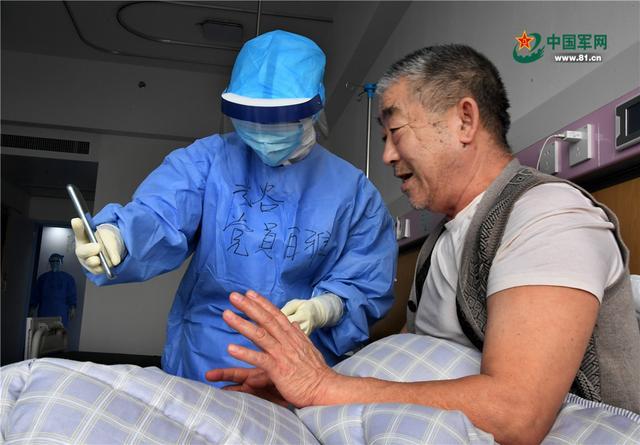 陳大爺?shù)氖謾C(jī)沒有視頻功能,護(hù)士白雅用自己的手機(jī)讓陳大爺與家人視頻。解放軍報(bào)記者 王傳順 攝