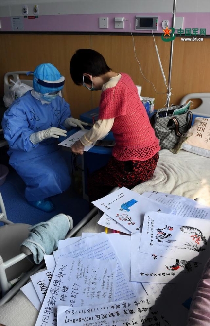 從死亡線上被拉了回來的陳女士,用筆給每名醫(yī)護(hù)人員畫了一幅畫、寫了一段祝福語,以表達(dá)對(duì)醫(yī)護(hù)人員的感激之情。解放軍報(bào)記者 王傳順 攝