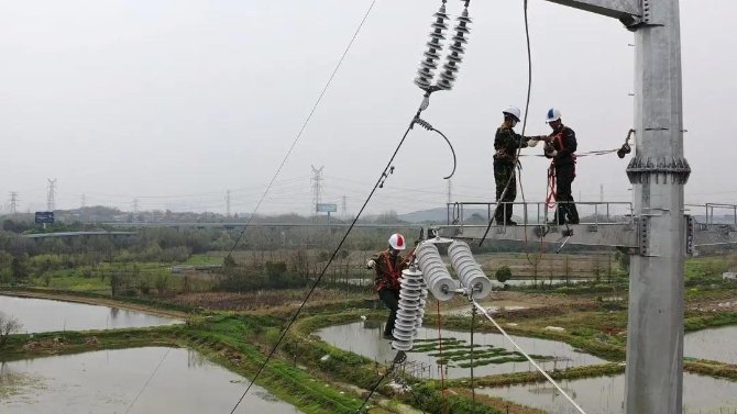 湖北武漢黃金口220千伏變電站110千伏配套工程也于24日開始施工。早上6點(diǎn),在現(xiàn)場設(shè)立的臨時(shí)指揮部里,施工人員要經(jīng)過一道“門”——進(jìn)行體溫測量和消毒。在一系列工前安全措施后,施工人員分別登上漢蔡高速匝道旁5基24米高的輸電鐵塔,有條不紊地進(jìn)行驗(yàn)電、掛接地線、解除跳線、放置滑車,最后拆除1560米長導(dǎo)線。