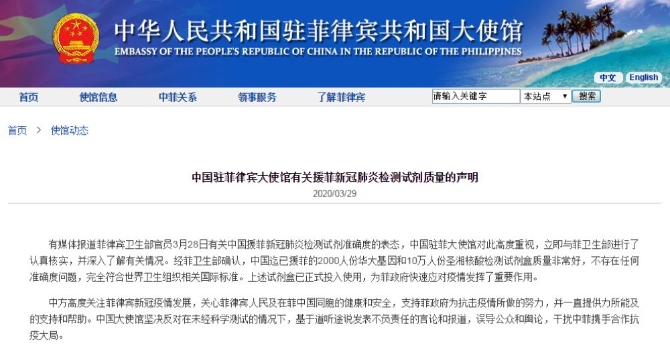 中國(guó)駐菲律賓大使館有關(guān)援菲新冠肺炎檢測(cè)試劑質(zhì)量的聲明