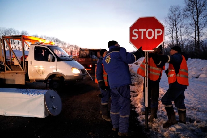 3月18日,在哈薩克斯坦努爾蘇丹,工作人員在哨卡處安裝“停止”標(biāo)識。新華社發(fā) 奧斯潘諾夫攝