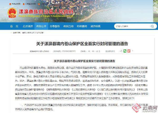 據(jù)漾濞彝族自治縣人民政府網(wǎng)站消息,自2020年3月29日起對(duì)漾濞縣境內(nèi)蒼山保護(hù)區(qū)實(shí)行封閉管理,解封時(shí)間另行通知。在此期間,任何單位和個(gè)人,未經(jīng)批準(zhǔn)不得進(jìn)入漾濞縣境內(nèi)蒼山保護(hù)范圍內(nèi)。