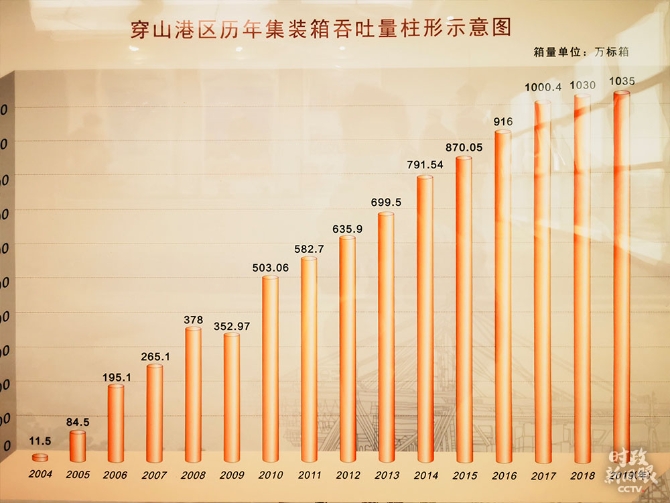 柱形圖清晰展示了2004—2019年穿山港區(qū)集裝箱吞吐量的增長(總臺央視記者史偉拍攝)