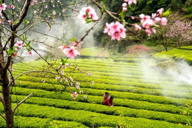 ▲2020年3月29日,湖北恩施,雨后初晴,薄霧繚繞,土家茶山宛如仙境,茶農(nóng)正在忙著采春茶。圖/視覺中國