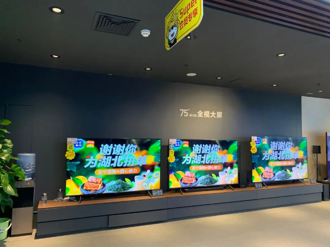 ▲ 蘇寧電器各賣場播放“謝謝你為湖北拼單”公益廣告