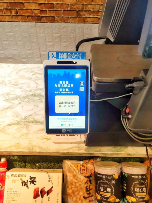 ▲ 盒馬鮮生賣場的支付設(shè)備投放“謝謝你為湖北拼單”公益廣告