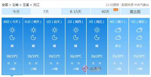 據(jù)元江縣氣象臺臺長姜希睿介紹,預(yù)計未來5天元江壩區(qū)高溫天氣將持續(xù),期間風(fēng)速較大,森林火險等級高。請相關(guān)部門做好森林防火工作,同時提醒各單位和個人注意防暑降溫。