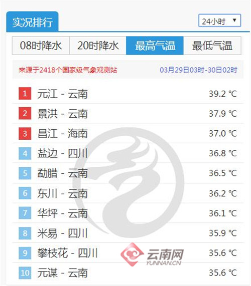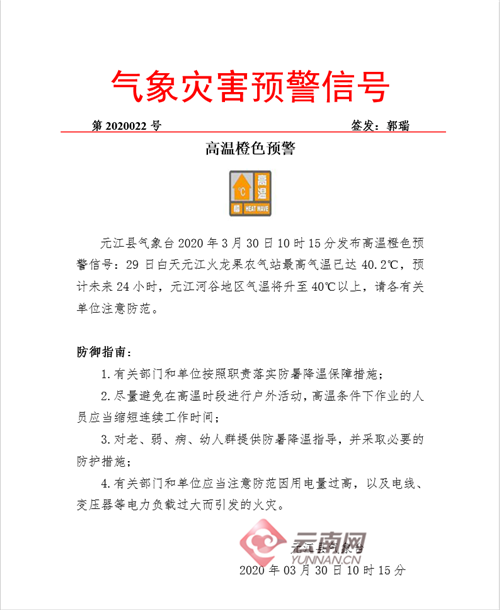 自2020年3月下旬以來,元江縣壩區(qū)逐漸步入高溫天氣。3月25日開始,已有5天氣溫連續(xù)超過35℃,其中超過37℃的有4天。最高氣溫出現(xiàn)在3月29日17時10分,氣溫為39.2℃。