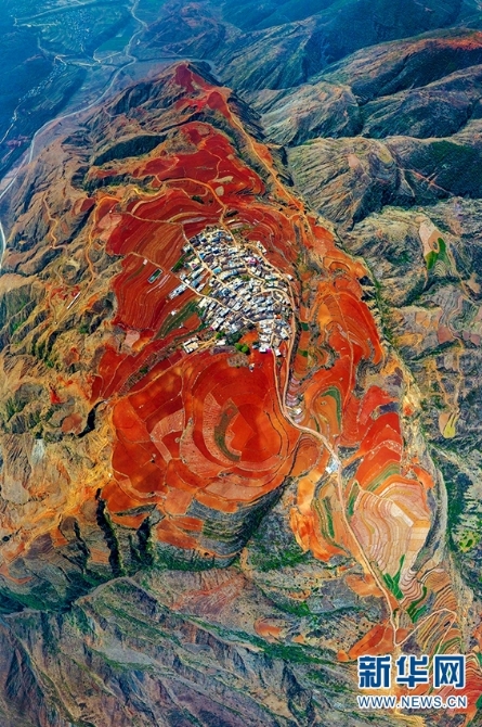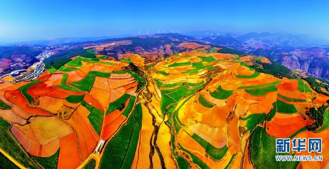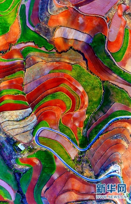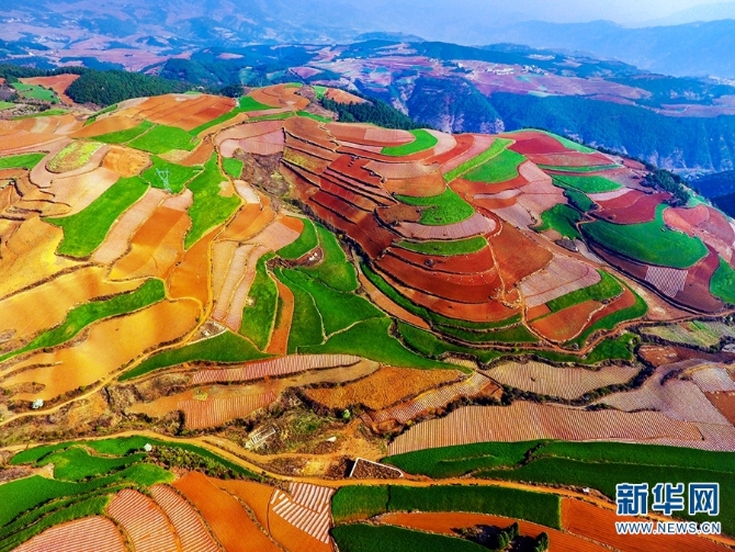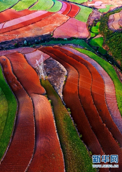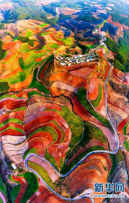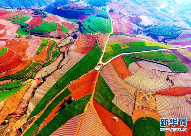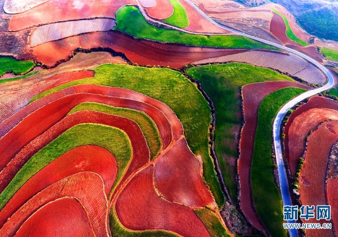 東川紅土地景區(qū),位于云南省昆明市東川區(qū)紅土地鎮(zhèn),獨(dú)特的紅色土壤成片地覆蓋在蜿蜒起伏的山地上,與綠色的莊稼、銀灰色的道路、白色的村莊等交相錯(cuò)雜,形成了一幅幅色彩斑斕、絢麗多姿的巨幅“油畫(huà)”。(新華網(wǎng) 崔永江/攝 念新洪/文)