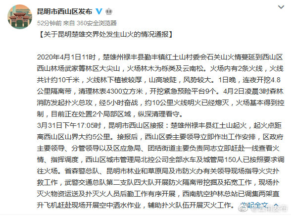 昆明信息港訊 機器人小明 【目前明火已撲滅!關于昆明楚雄交界處發(fā)生山火的情況通報】2020年4月1日11時,楚雄州祿豐縣勤豐鎮(zhèn)紅土山村委會石關山火情蔓延到西山區(qū)西山林場武家箐林區(qū)大尖山,火場林木為櫟類及云南松?;饒鰞扔?條火線,火線共計約10千米,火線林下植被較厚,山高坡陡,風勢較大。1日晚,連夜開挖4.8公里隔離帶,清理林表4300立方米,開挖緊急預險平臺9個。4月2日凌晨3時森林消防發(fā)起撲火總攻,經5小時奮戰(zhàn),約10公里火線明火已經熄滅,火場基本得到控制,目前正在處置2個局部區(qū)域,縱深清理看守。