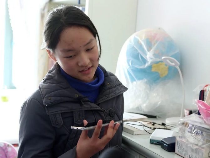 14歲的初中生孫婉清在家中使用手機和父親通話(1月29日攝)。新華社記者 李賀 攝