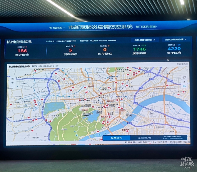 這是杭州城市大腦運(yùn)營指揮中心“數(shù)字治疫”的應(yīng)用展示,能清晰看到截至3月30日17時杭州的疫情分布情況,這些數(shù)據(jù)來源于市衛(wèi)健委、公安局、數(shù)據(jù)局。(總臺央視記者王萌萌拍攝)