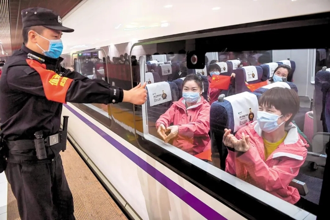 3月17日,隔著動車的玻璃,武漢火車站值勤民警向即將離開武漢的湖南省援鄂醫(yī)療隊常德市第一人民醫(yī)院護(hù)士豎起大拇指,護(hù)士們也回以“點(diǎn)贊”“愛心”手勢。 湖北日報全媒記者 陳勇,通訊員 趙軍/攝