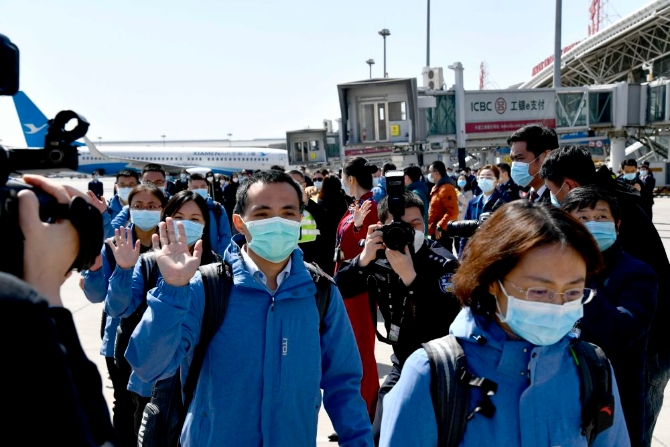 3月28日,山東省赴英國聯(lián)合工作組成員在濟南遙墻國際機場登機,趕赴英國,慰問在英華僑華人、中資機構(gòu)和廣大留學(xué)生,支援當(dāng)?shù)乜箵粢咔?。新華社記者 郭緒雷 攝