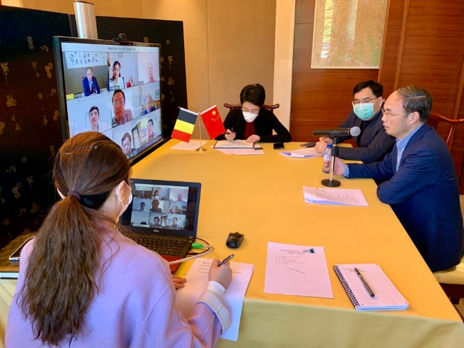 中國駐比利時大使曹忠明還與華人醫(yī)生服務(wù)隊舉行視頻工作會議,與九個學(xué)聯(lián)主席及留學(xué)生代表進行視頻連線,指導(dǎo)他們做好防疫。