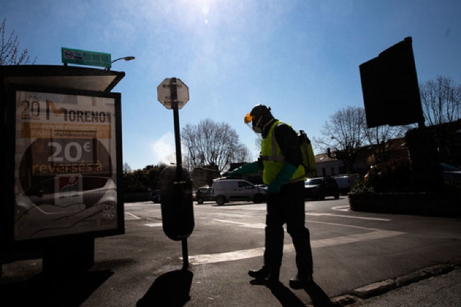 3月30日,在法國巴黎以東的訥伊普萊桑斯,工作人員在街頭進行消毒防疫工作。新華社發(fā)