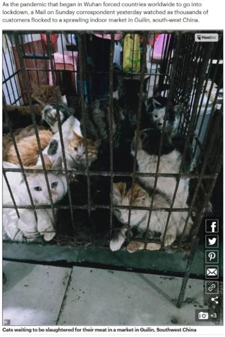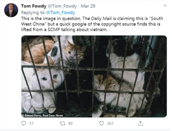 值得注意的是,幾家英國主流媒體不約而同地指責(zé)野生動物市場在中國重新開放,內(nèi)容追根溯源來自英國著名“小報”《每日郵報》3月29日的文章。該報道稱中國全面禁止非法野生動物交易后,近日多個城市的野味市場重開,并使用了貓狗被困籠中的照片。文章稱照片是3月28日在中國桂林市拍攝的,而熱心網(wǎng)友卻發(fā)現(xiàn)該照片實際是2015年在越南拍的。