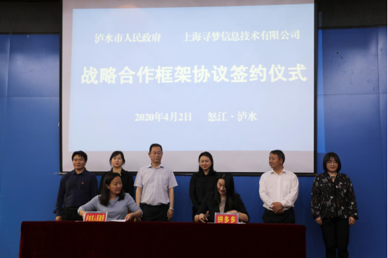 瀘水市委書記陳銳(后排左三)高度評(píng)價(jià)多多農(nóng)園的扶貧價(jià)值,瀘水市委副書記、市長(zhǎng)和桂蓮(前排左一)與拼多多簽約。