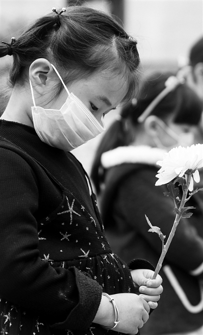 4月4日,四川省華鎣市華鎣山廣場(chǎng),一位小朋友手捧鮮花默哀。邱海鷹攝(中經(jīng)視覺(jué))