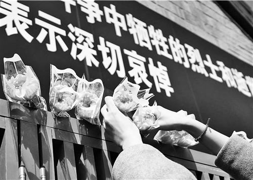 4月4日,北京市前門(mén)街道草廠社區(qū),居民們?yōu)闋奚沂亢褪攀劳I(xiàn)上鮮花。本報(bào)記者 趙 晶攝