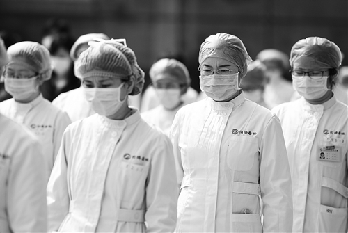 4月4日,湖北省武漢市華中科技大學(xué)同濟(jì)醫(yī)學(xué)院附屬同濟(jì)醫(yī)院醫(yī)護(hù)人員在默哀。本報(bào)記者 高興貴攝