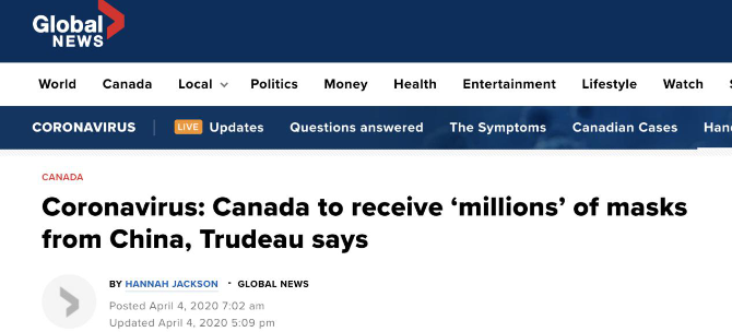 加拿大《環(huán)球郵報(bào)》4日報(bào)道,加拿大總理特魯多宣布,將從中國接收“數(shù)以百萬計(jì)”的醫(yī)用口罩。特魯多稱,在接下來的48小時(shí)內(nèi),加拿大將從中國租用貨運(yùn)航班運(yùn)送數(shù)百萬個(gè)口罩。加拿大還租賃了中國的一個(gè)倉庫,以“盡快”收集和分發(fā)其他物資。