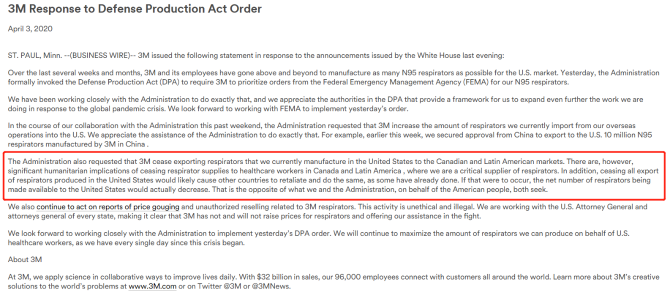 4月3日,3M公司發(fā)表公開聲明,稱過去的幾周和幾個(gè)月里,3M全體員工都在超負(fù)荷工作,為美國乃至全世界制造盡可能多的N95。