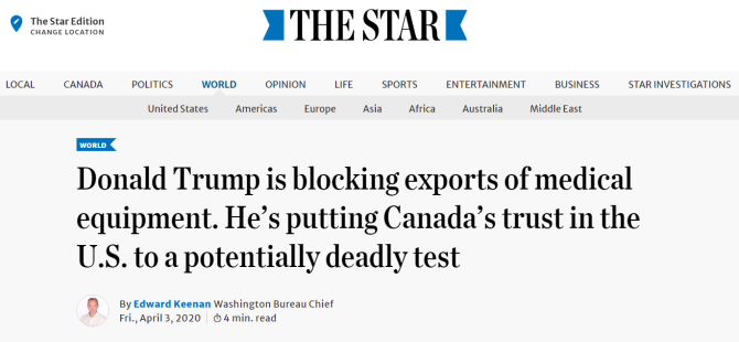 特魯多當(dāng)天舉行發(fā)布會,稱阻止醫(yī)療物資出口是一個(gè)“錯(cuò)誤”,這么做可能會適得其反。他指出,每天都有數(shù)千名護(hù)士從加拿大前往美國底特律的醫(yī)院工作,保持兩國物資和人員流通對雙方都有重要意義。