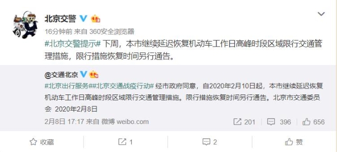 4月5日,在北京市新冠肺炎疫情防控工作新聞發(fā)布會上,北京市交通委副主任容軍介紹,自春節(jié)假期結束以來,為了減少通勤交通形成的人員聚集,嚴防疫情通過公共交通工具擴散,北京市暫停了機動車工作日高峰時段區(qū)域限行的交通管理措施,也就是機動車尾號限行措施。根據有關通告,本輪機動車尾號限行政策有效期為2019年4月8日起至2020年4月5日止,也就是到今天結束。