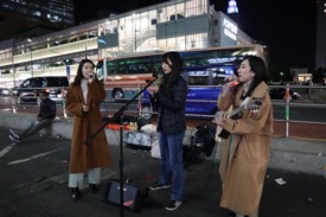 中田彩香(中)等在東京街頭演唱。受訪者供圖