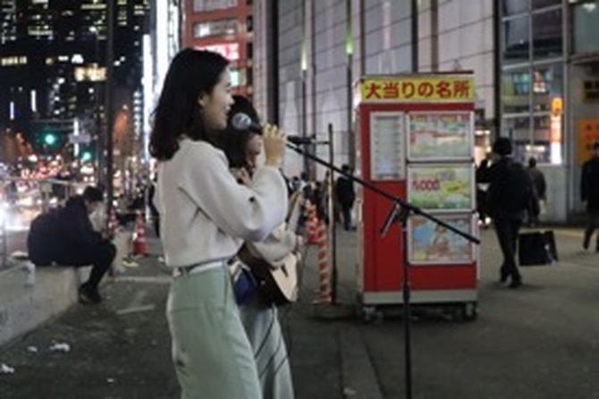 中田彩香等在東京街頭演唱。受訪者供圖