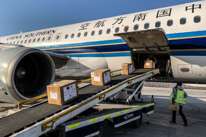 3月16日,工作人員在沈陽(yáng)桃仙國(guó)際機(jī)場(chǎng)將捐贈(zèng)給日本的防疫物資裝機(jī)。新華社記者 潘昱龍 攝