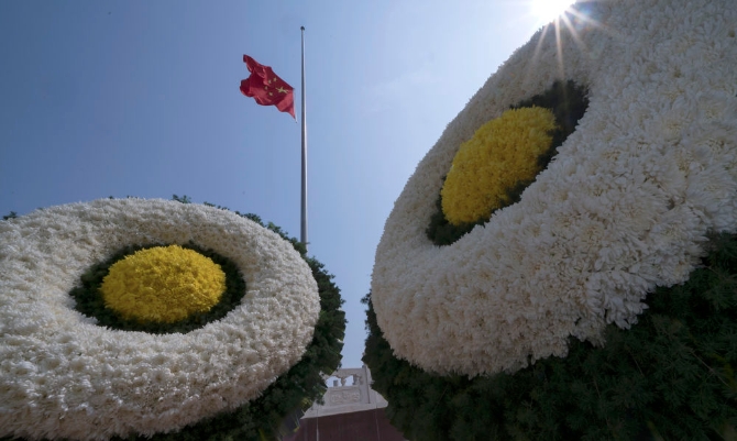 4月4日,武漢漢口江灘一元廣場下半旗志哀。(新華社記者費茂華攝)