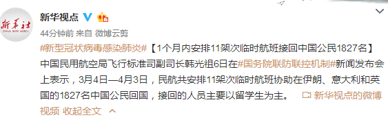 【1個(gè)月內(nèi)安排11架次臨時(shí)航班接回中國(guó)公民1827名】中國(guó)民用航空局飛行標(biāo)準(zhǔn)司副司長(zhǎng)韓光祖6日在#國(guó)務(wù)院聯(lián)防聯(lián)控機(jī)制#新聞發(fā)布會(huì)上表示,3月4日—4月3日,民航共安排11架次臨時(shí)航班協(xié)助在伊朗、意大利和英國(guó)的1827名中國(guó)公民回國(guó),接回的人員主要以留學(xué)生為主。