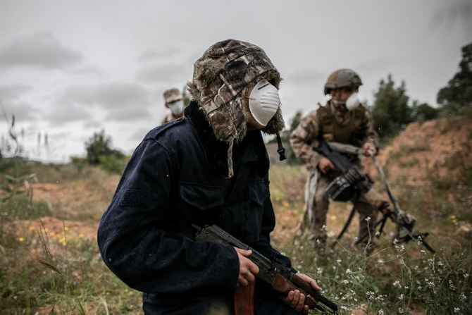 3月25日,在利比亞的黎波里,利比亞民族團結(jié)政府武裝人員在戰(zhàn)斗中佩戴口罩。新華社發(fā)(阿姆魯攝)