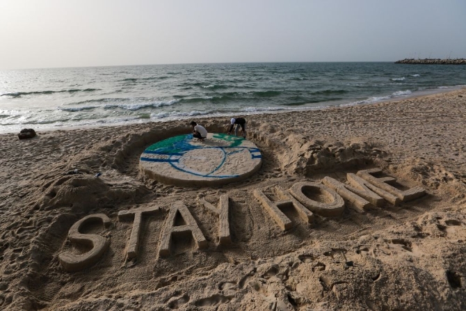 3月31日,在加沙城的一處海灘,一位藝術(shù)家以沙作畫,以此呼吁人們減少外出,注意防范新冠病毒。新華社發(fā)(里澤克攝)