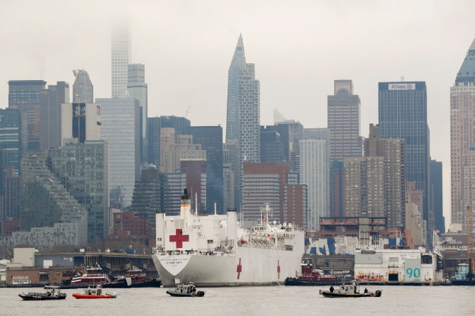 3月30日,在美國(guó)紐約,美國(guó)海軍醫(yī)院船“舒適”號(hào)停泊在一處碼頭。新華社發(fā)(廣羽攝)