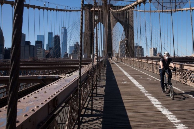 3月27日,一名戴口罩的男子騎車(chē)經(jīng)過(guò)美國(guó)紐約布魯克林大橋的棧道。新華社發(fā)(郭克攝)
