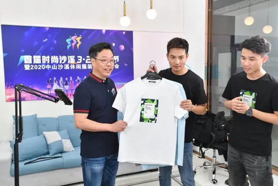 3月28日,中山市沙溪鎮(zhèn)黨委書記文衛(wèi)戈(左)客串主播,在直播平臺(tái)推介該鎮(zhèn)的休閑服裝。