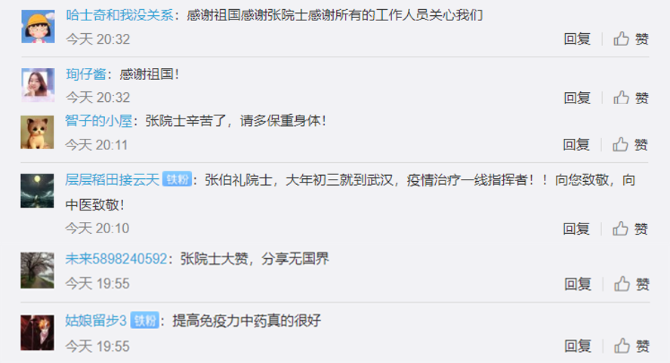 直播間里,網(wǎng)友們熱情參與討論,感謝張伯禮院士和抗疫一線工作人員的付出↓↓↓