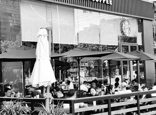 記者來到金鷹廣場發(fā)現(xiàn),星巴克、奈雪的茶兩家店里外都坐滿了消費者。