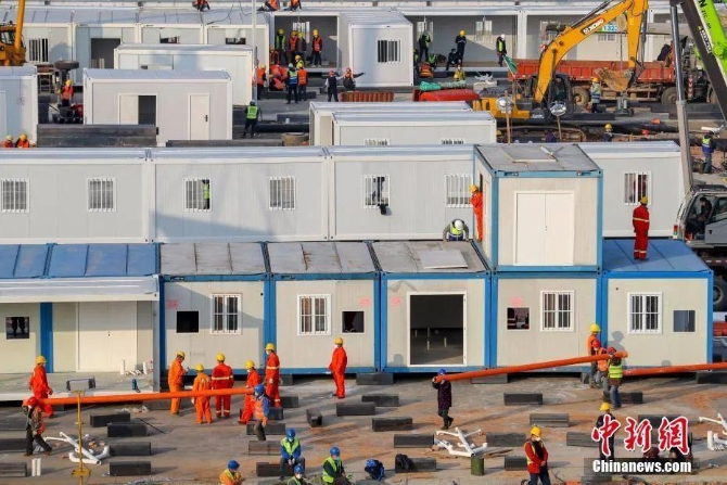 資料圖:1月30日,火神山醫(yī)院施工現(xiàn)場,各項(xiàng)施工項(xiàng)目在全速推進(jìn)中。 中新社記者 張暢 攝