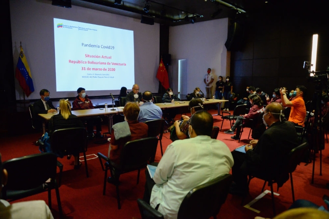 2020年3月30日,中國(guó)向委內(nèi)瑞拉派遣的抗疫醫(yī)療專家組抵達(dá)委內(nèi)瑞拉首都加拉加斯,中方捐贈(zèng)的檢測(cè)試劑、防護(hù)用品、藥品等物資也一同抵達(dá)。這是3月31日,在委內(nèi)瑞拉首都加拉加斯,中委醫(yī)療專家參加工作會(huì)議并交流。(新華社發(fā))