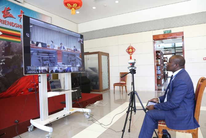 2020年3月18日,在津巴布韋首都哈拉雷,津巴布韋衛(wèi)生部和首都哈拉雷市的醫(yī)衛(wèi)官員在中國(guó)駐津巴布韋大使館參加視頻會(huì)議。當(dāng)日,中國(guó)同非洲國(guó)家首次就新冠肺炎疫情防控舉行專家視頻會(huì)議。埃塞俄比亞、肯尼亞、利比里亞等國(guó)衛(wèi)生部長(zhǎng),非洲疾控中心副主任等24個(gè)非洲國(guó)家的政府官員、衛(wèi)生專家以及世界衛(wèi)生組織駐部分國(guó)家代表等共近300人通過(guò)網(wǎng)絡(luò)在線與會(huì)。(新華社記者張玉亮攝)